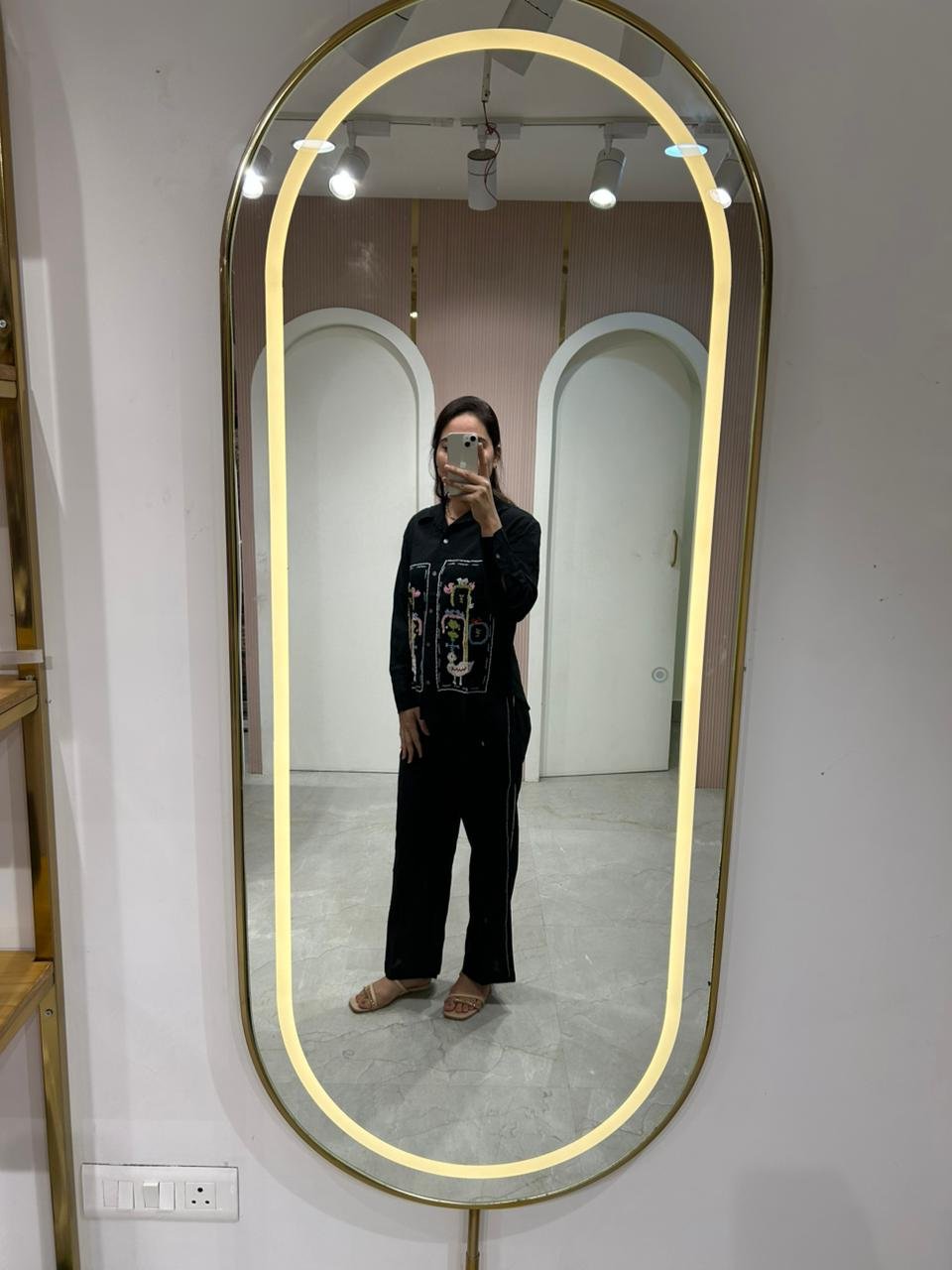 A sophisticated two-piece co-ord set in classic black, featuring a long tunic with vibrant, multi-coloured floral embroidery on the front and sleeves, paired with matching black palazzo pants. The set combines traditional craftsmanship with a modern silhouette, making it ideal for casual outings, semi-formal events, or festive occasions.