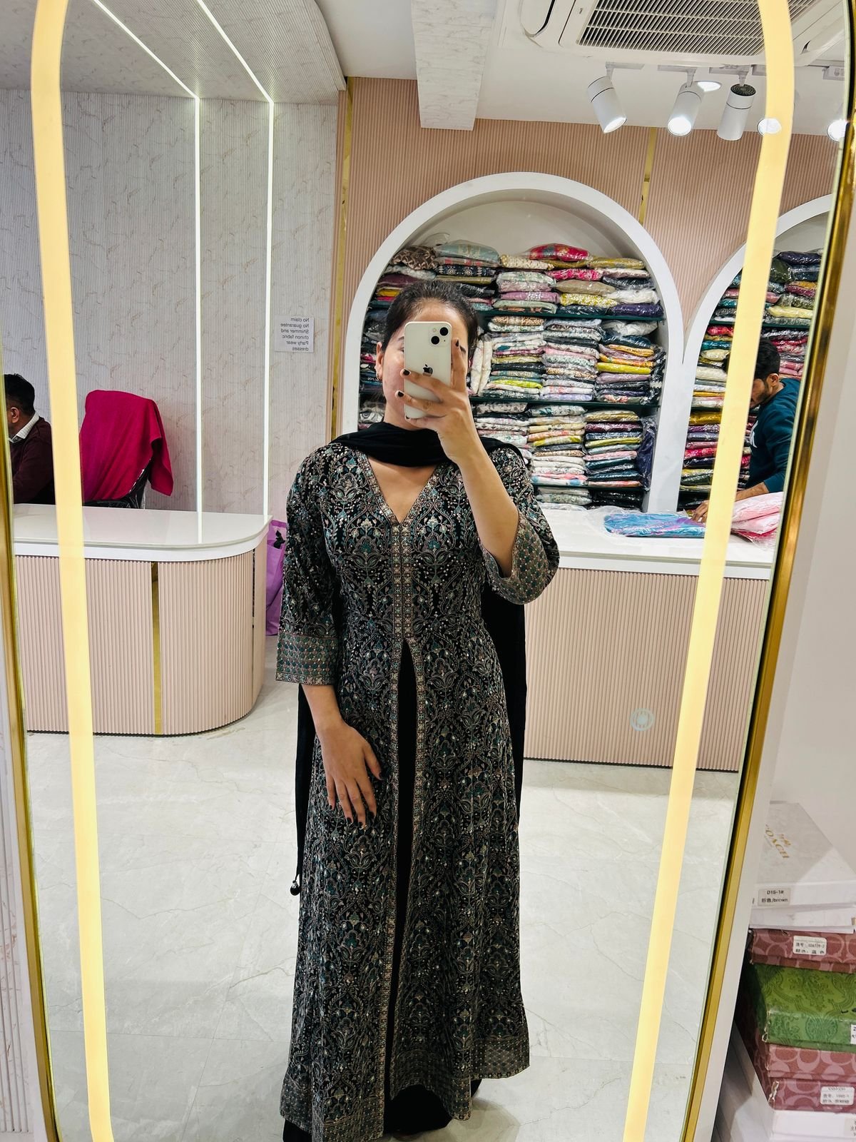 A full-length dress with detailed embroidery in teal, silver, and black, featuring a deep V-neckline and 3/4th sleeves. Paired with a black dupatta for a complete ethnic look.
