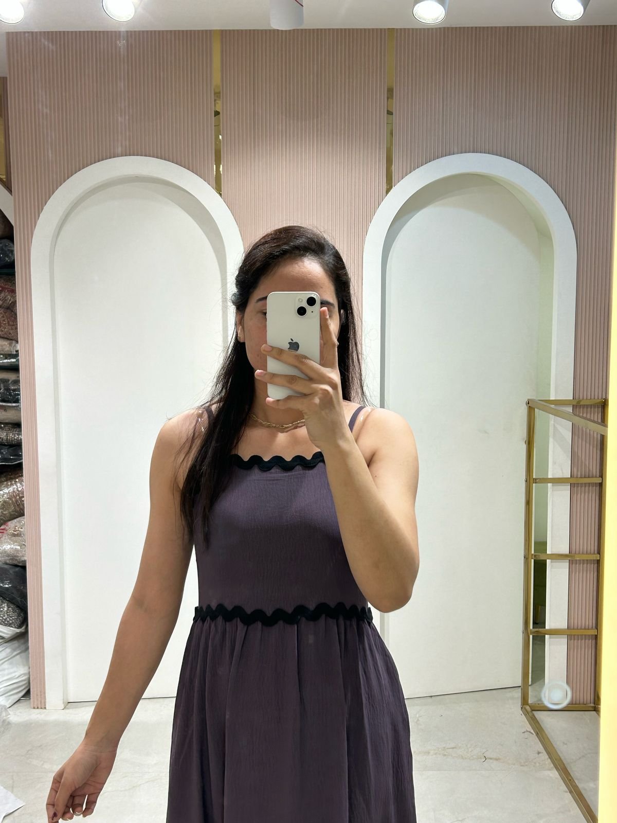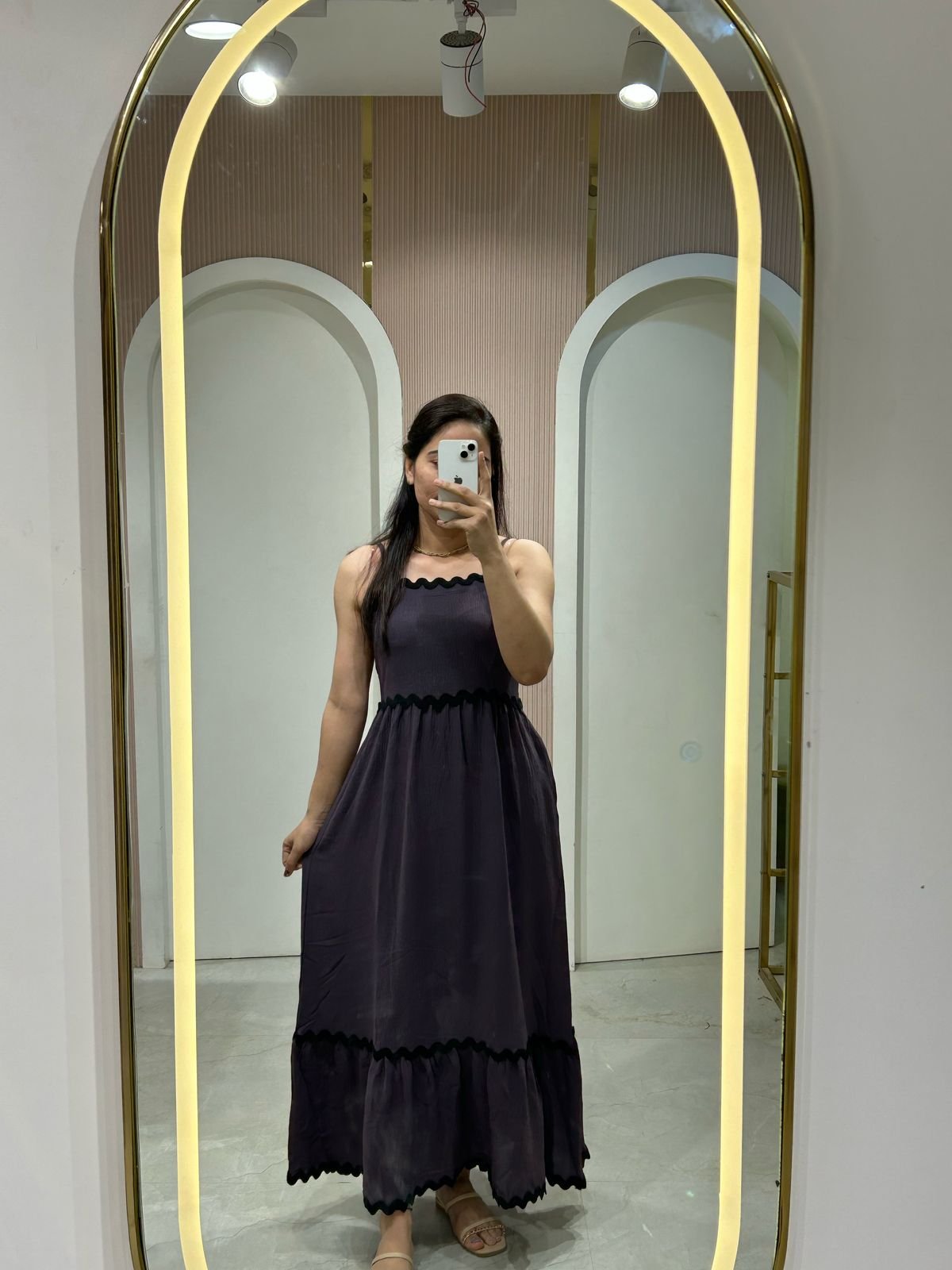 A chic maxi dress in a deep charcoal hue with a textured fabric. Features thin straps, a scalloped neckline with black trim, and a tiered skirt for a flowing silhouette. Perfect for casual or semi-formal occasions.