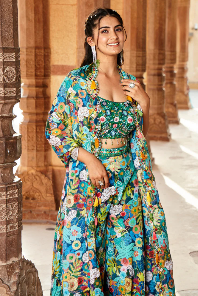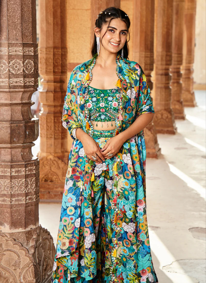 The featured ensemble consists of a green halter top adorned with vivid handiwork, matched with wide sharara bottoms and a coordinating cape. The cape flaunts a lively floral pattern on smooth green chinnon material, while the pants provide both grace and ease. With its vibrant and sophisticated design, the cape offers a chic finishing touch, ideal for any special occasion.