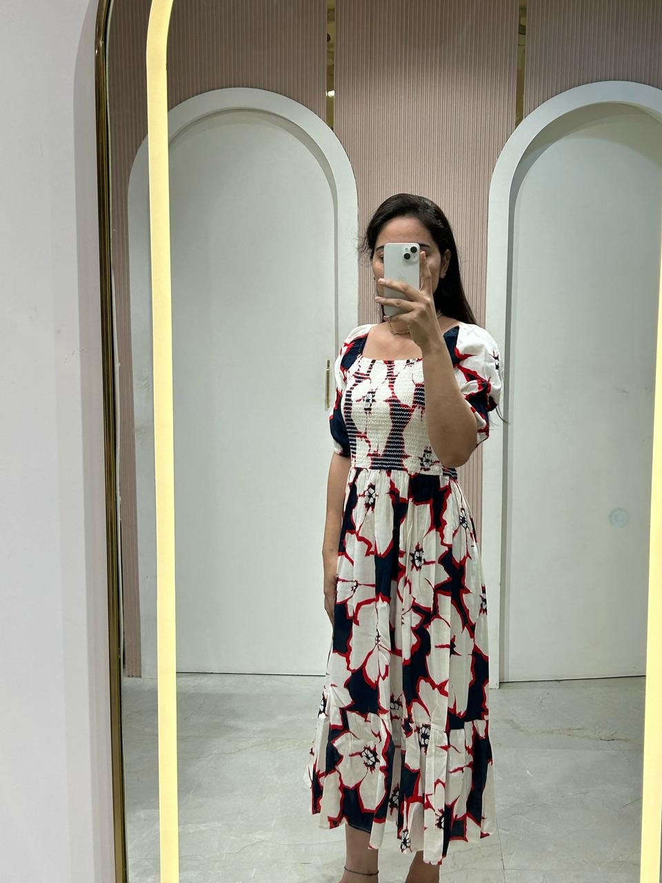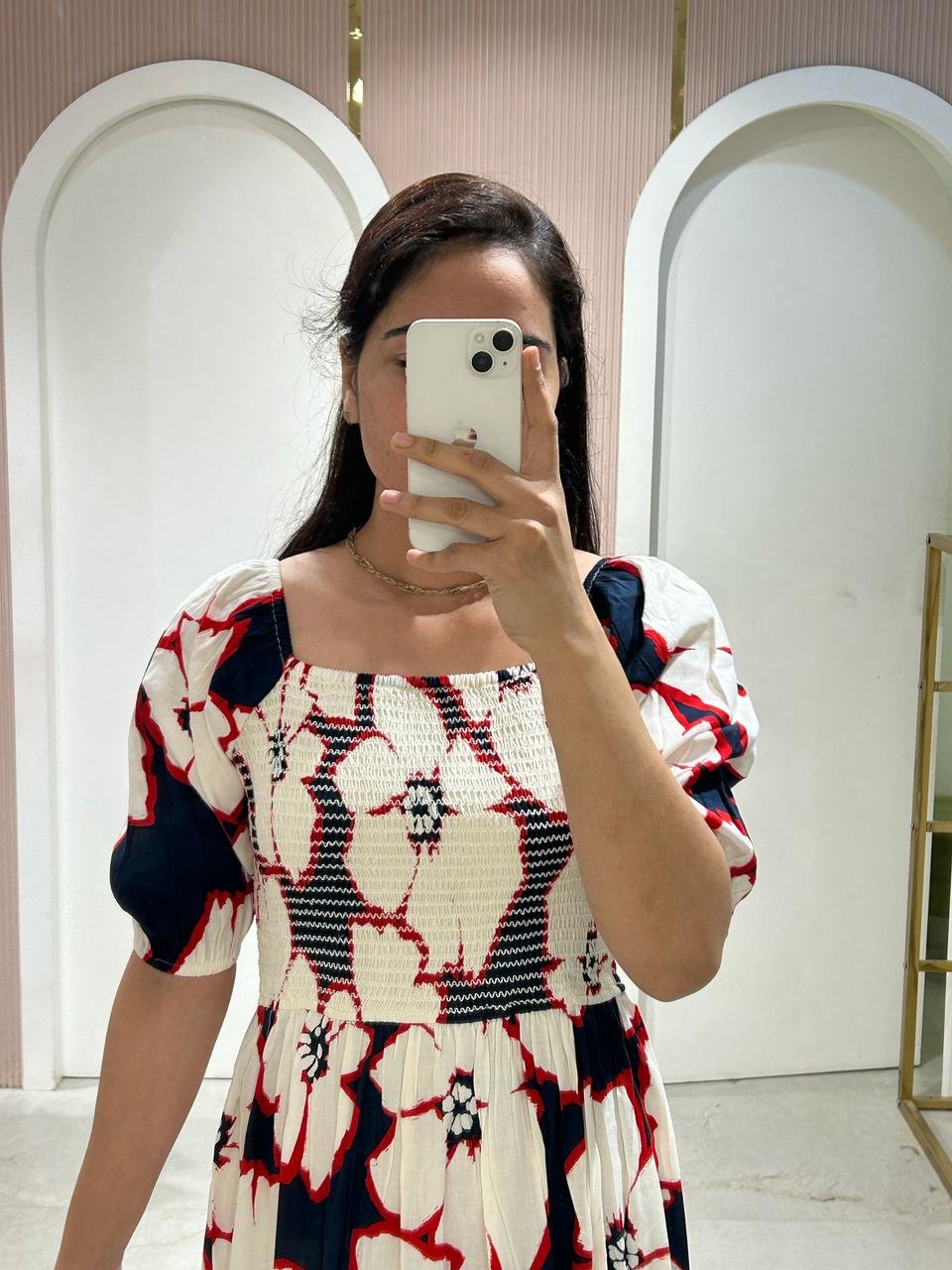 A stylish midi dress in white with bold red and navy floral print. Features a square neckline, puffed short sleeves, and a smocked bodice for a flattering fit. Perfect for summer outings or casual events.