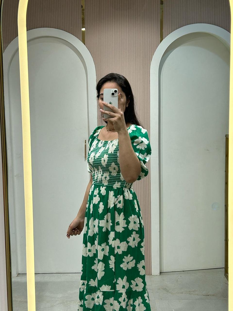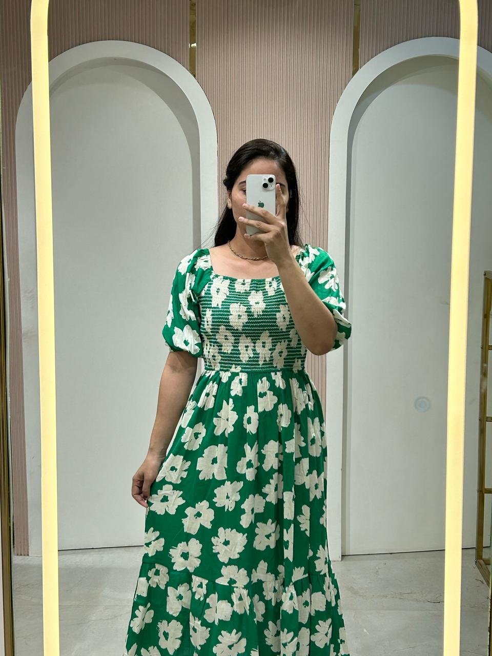 A vibrant maxi dress in green with a bold white floral print. Features a square neckline, puffed short sleeves, and a smocked bodice for a flattering fit. Ideal for summer events or casual outings.