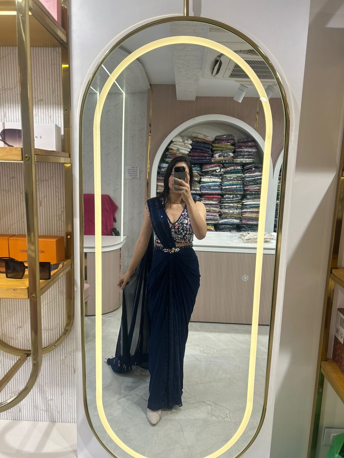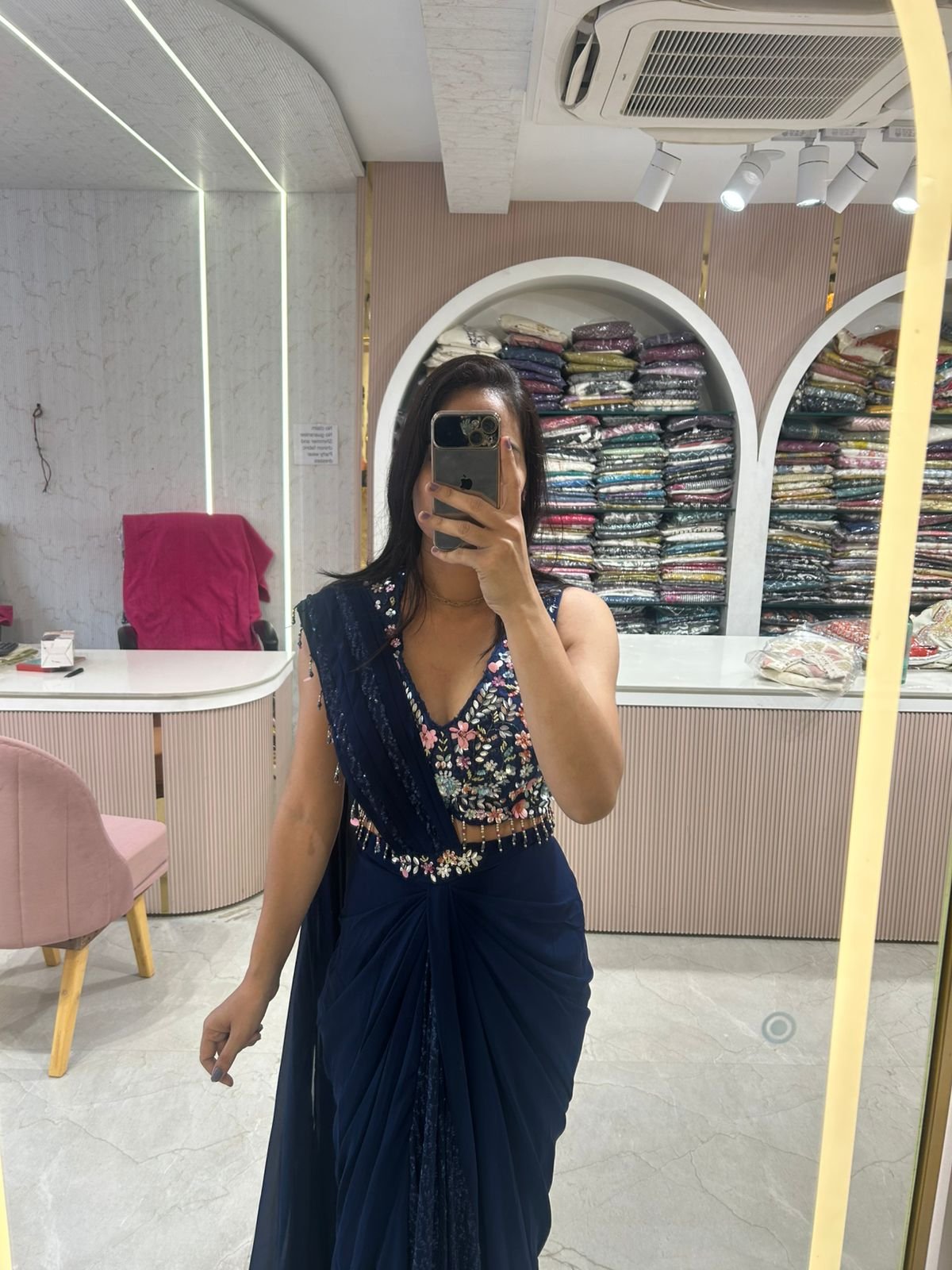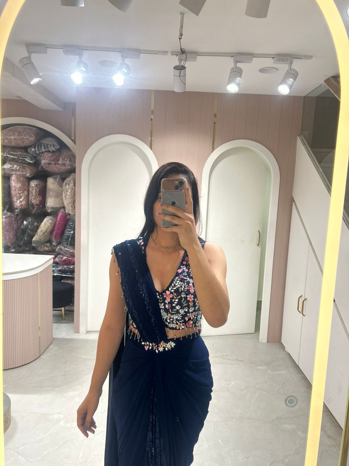 A luxurious navy blue saree featuring a sheer, sequined fabric with a floral-embellished blouse adorned with intricate embroidery and beadwork. The saree drapes elegantly with a subtle shimmer, paired with a heavily embroidered blouse that adds a touch of glamour. Ideal for weddings, parties, or festive celebrations.