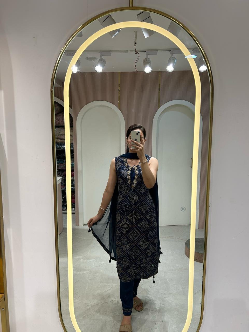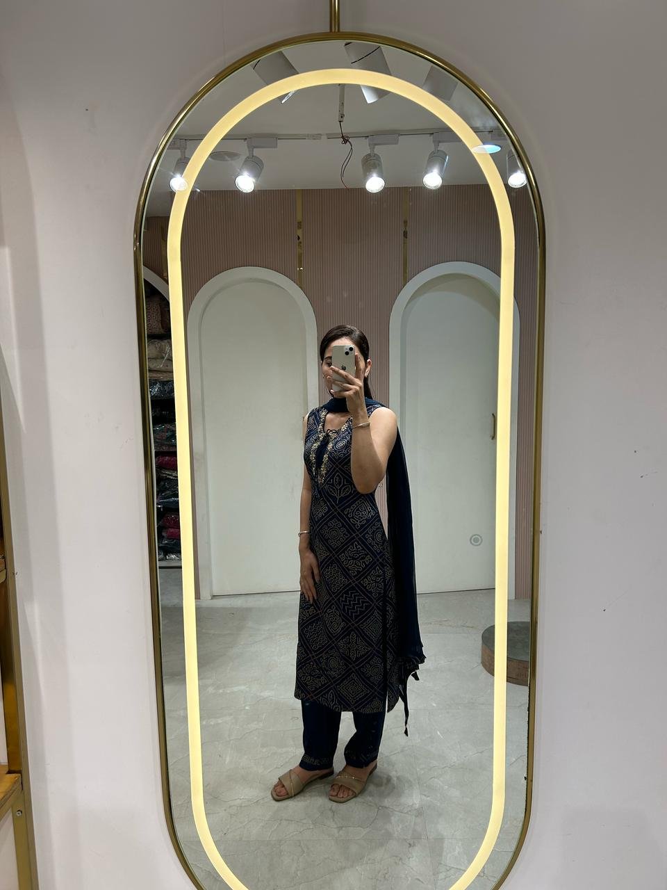 Exude tradition with the Navy Heritage Suit, featuring intricate gold embroidery on a deep navy base. This three-piece ensemble with a kurta, palazzo pants, and dupatta is perfect for festive celebrations.