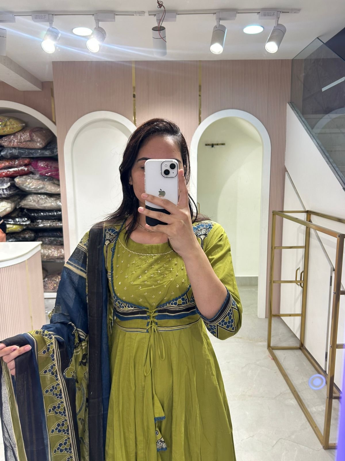 A graceful three-piece Anarkali suit set in a vibrant olive green hue, featuring a floor-length Anarkali tunic with intricate embroidery along the neckline, sleeves, and hem. Paired with a matching churidar and a contrasting dark blue dupatta with detailed borders. Ideal for festive celebrations, weddings, or traditional gatherings.