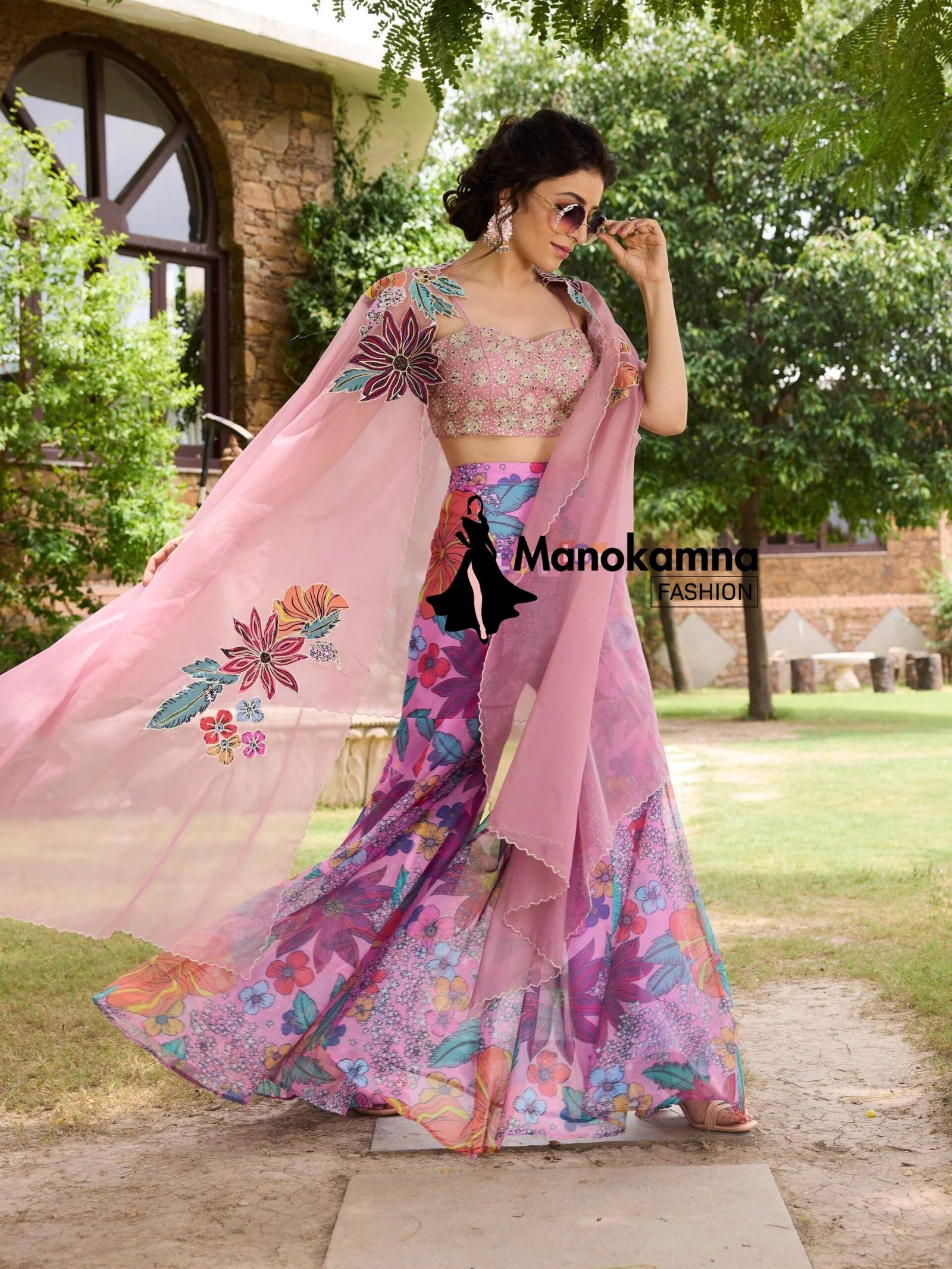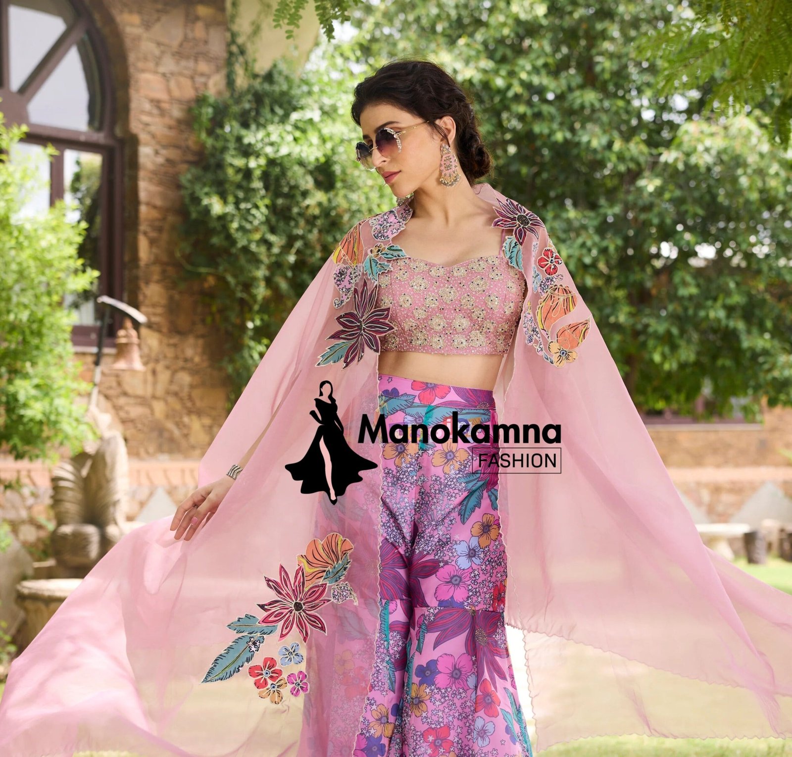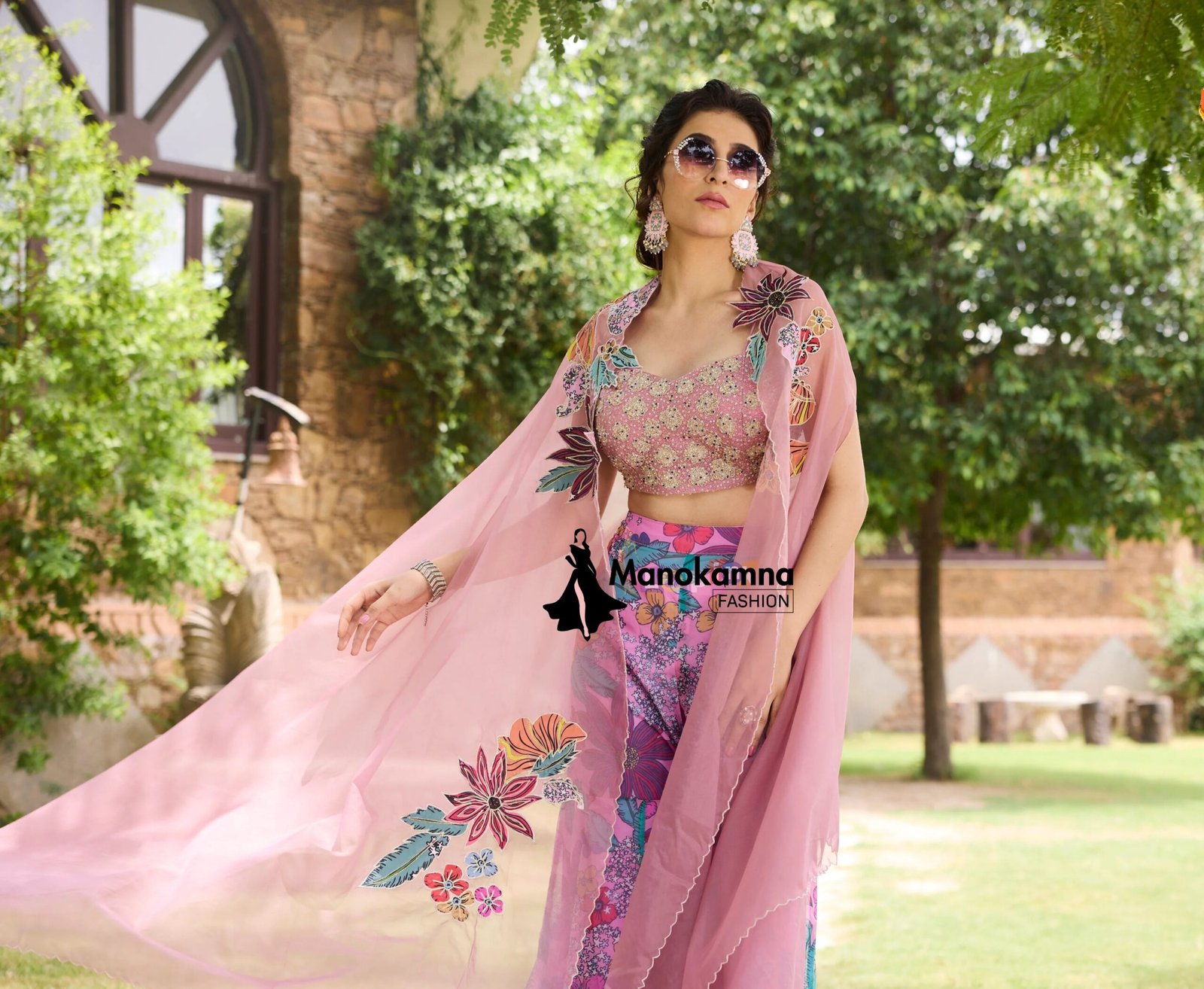 This fashionable divider set showcases a trendy crop top embellished with intricate pearl detailing, imbuing a sense of refinement. Paired with a graceful cape, this duo exudes sophistication and is ideal for formal gatherings, blending contemporary prints with opulent elements for a striking appearance.