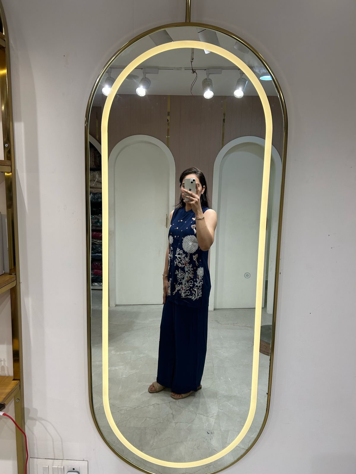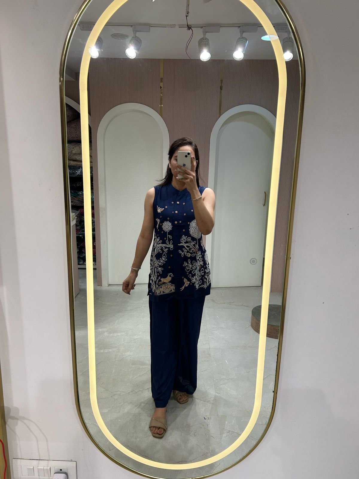 A chic navy blue sleeveless kurta set with intricate thread embroidery and sequin detailing, ideal for both casual elegance and festive charm.