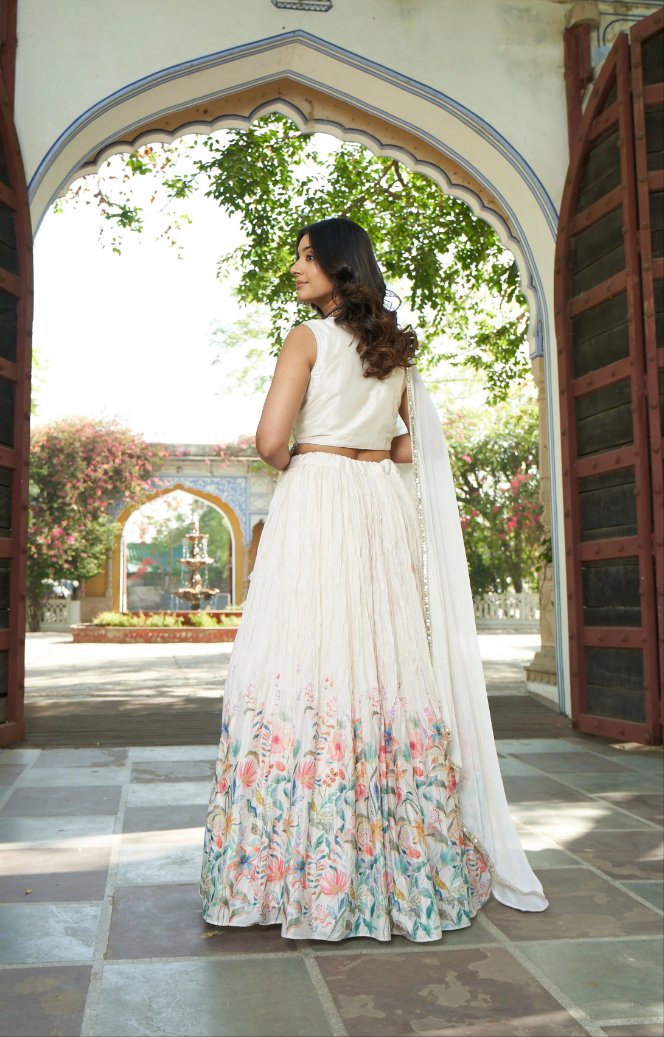 Experience the timeless elegance of our Whispering White Crop Top Lehenga – a stunning combination of a delicate lace top and flowing skirt. Perfect for weddings and special occasions, this ensemble effortlessly blends tradition with modern charm.