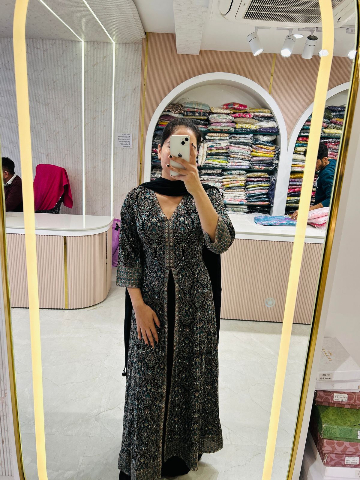 A full-length dress with detailed embroidery in teal, silver, and black, featuring a deep V-neckline and 3/4th sleeves. Paired with a black dupatta for a complete ethnic look.