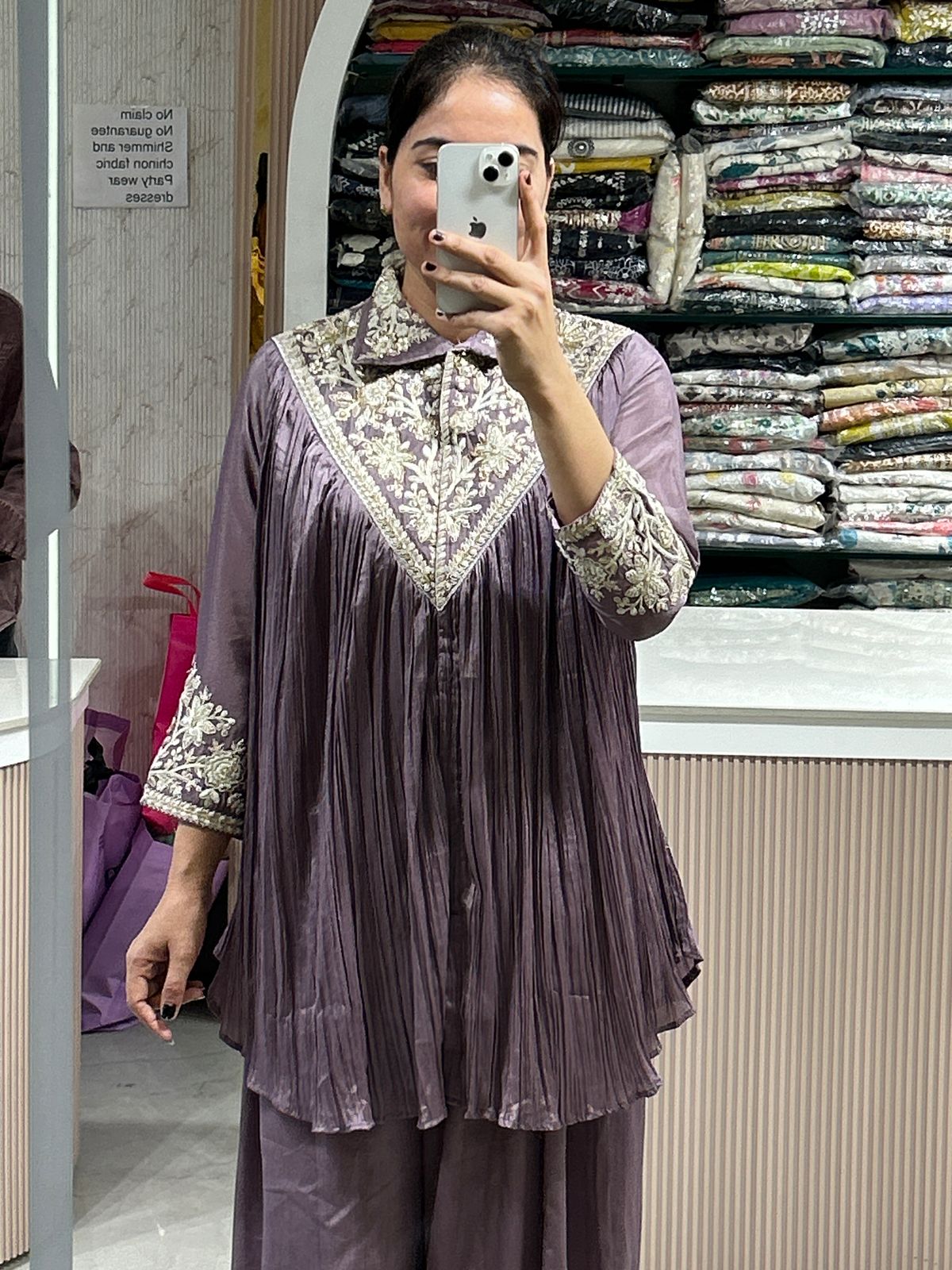 Step into grace and sophistication with this stunning sharara set, featuring a flowy pleated short kurta adorned with intricate embroidered yoke and collar design. The rich purple hue adds a royal touch, making it a perfect pick for festive occasions, weddings, or evening parties.