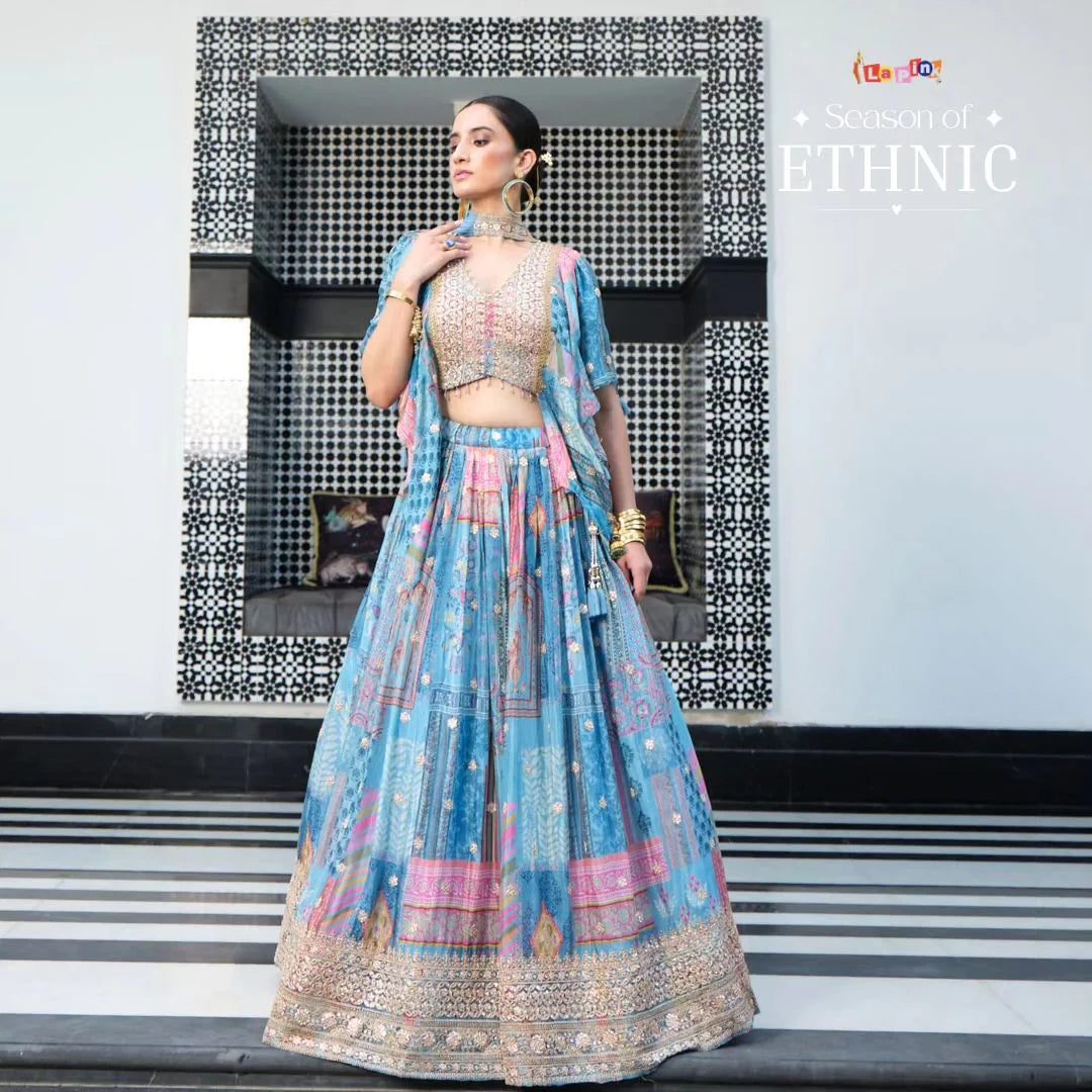 This printed lehenga set with balloon sleeves offers a blend of traditional elegance and modern fashion. The vibrant printed lehenga is complemented by a stylish top with balloon sleeves, resulting in a chic and trendy outfit.