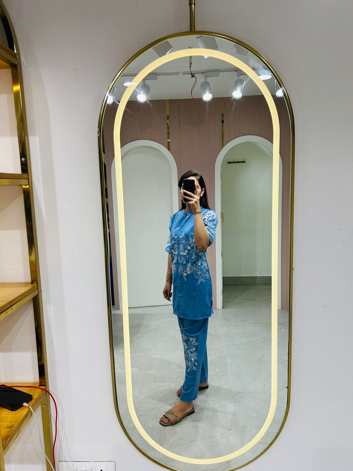 Description: Chic sky blue kurta set with delicate white floral embroidery. Ideal for casual or festive occasions, this two-piece set blends style and comfort.
