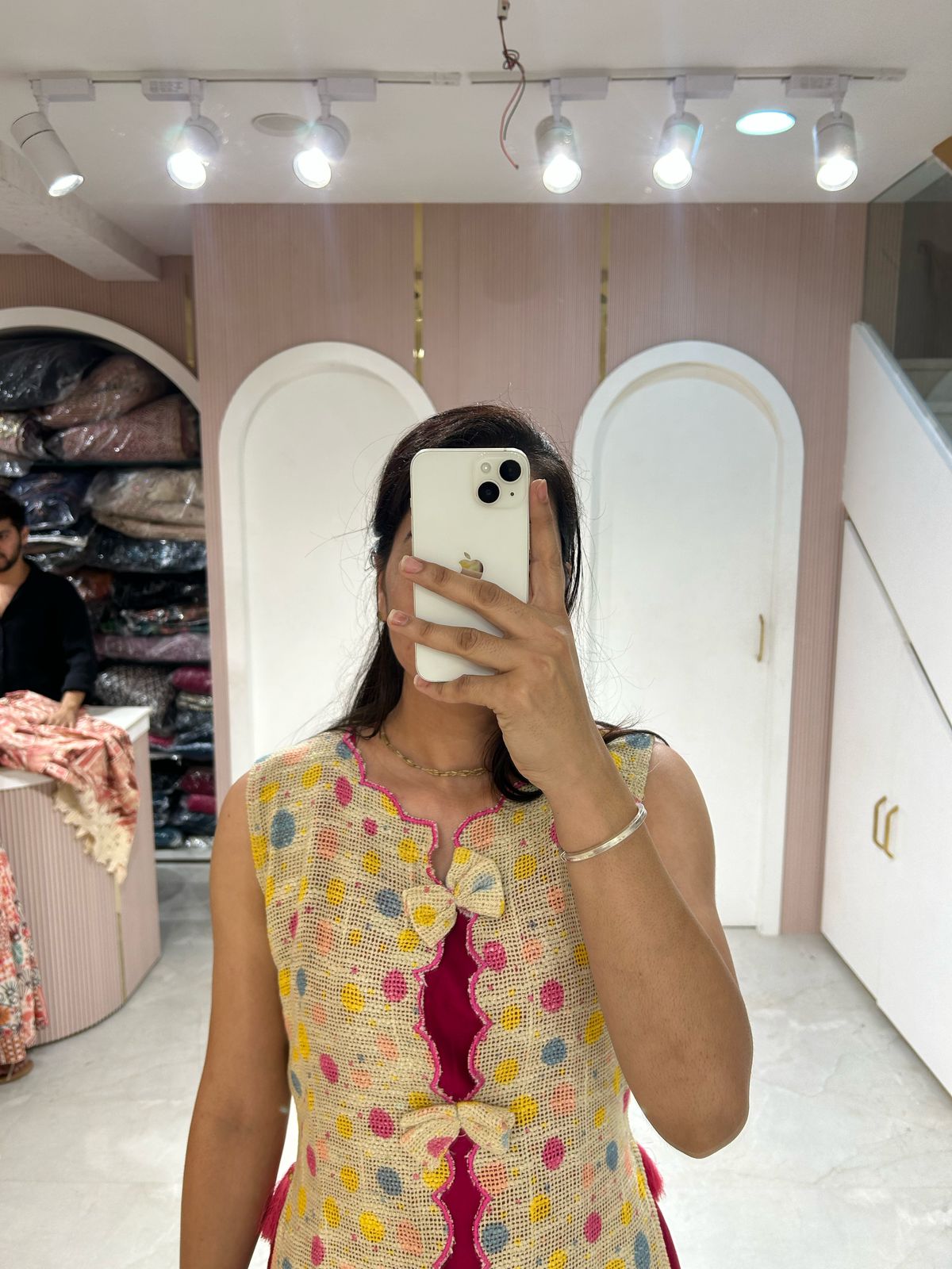 This three-piece ensemble with a kurta, pants, and dupatta is perfect for festive gatherings.